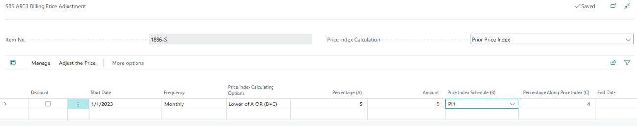 In the SBS ARCB Billing Price Adjustment page, you set Price Index Calculation to Prior Price Index.
