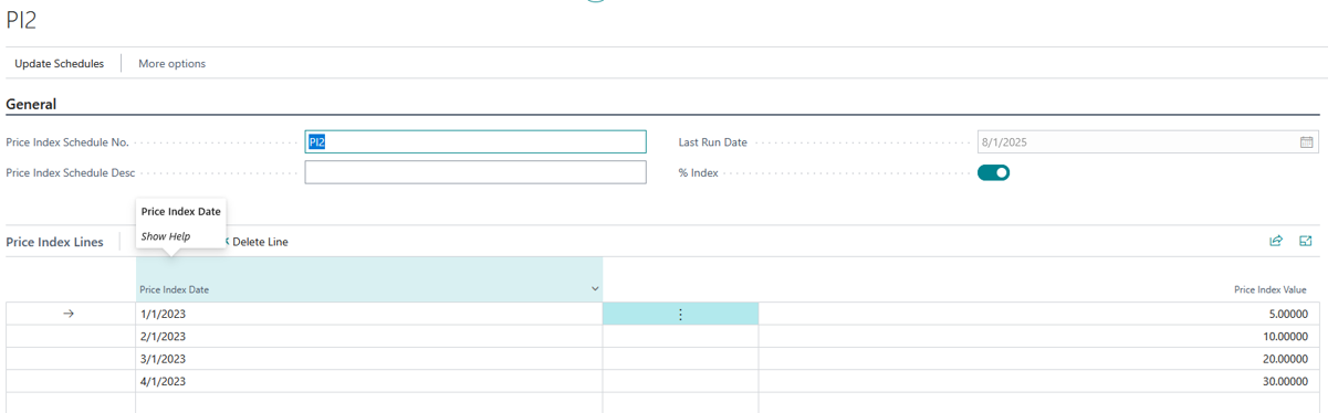 In the Price Index master page, under the Price Index master fields, there is a Boolean button named % Index, which will define whether the Price index Values on the Price index lines will be in % or not.. If this is enabled, then the calculations will be in percent.