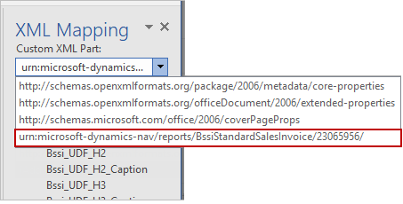 - In the Developer tab, select XML Mapping pane and in Custom XML Part, select the custom XML part for ADD INCLUDE report, which is typically last in the list.