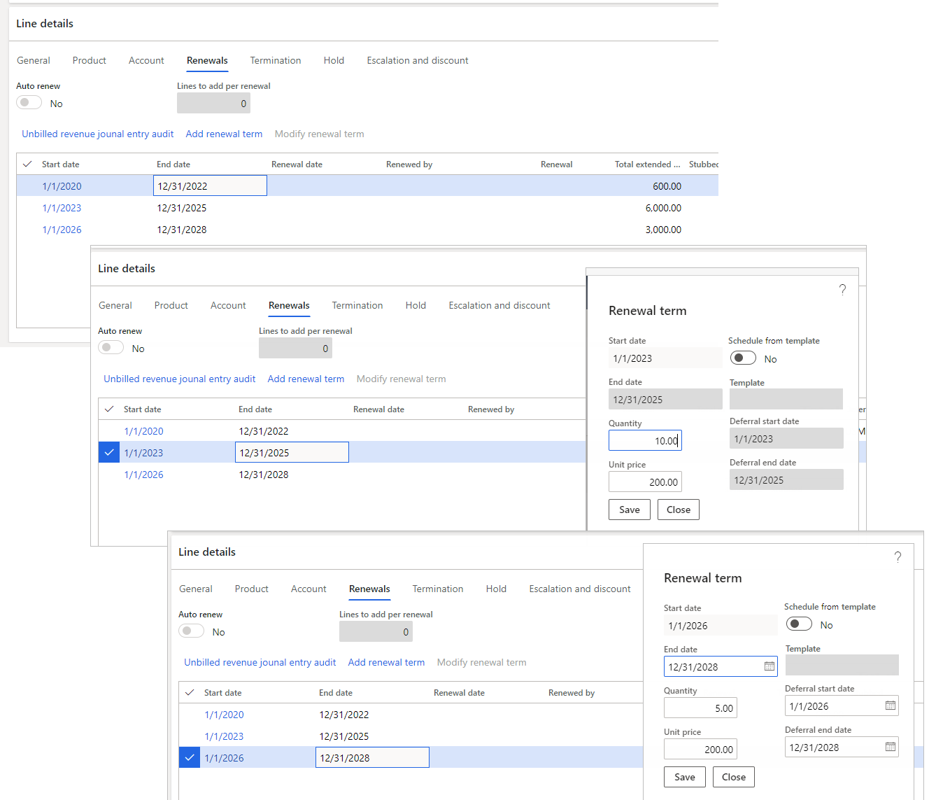 If a renewal term exists after the term you are modifying, the dates of the term cannot be changed. In this case, you can change only the quantity and unit price for the renewal item. For example, three terms exist. The first term cannot be changed because it has already started. For the second term, only the quantity and unit price can be changed. For the third term, all values can be changed, except the start date. ClosedView image.
