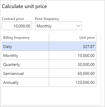 The following example shows the calculated unit price for a billing schedule, where one of the standard price frequencies (daily, monthly, quarterly, semiannually, and annually) is used. A billing schedule has a frequency of Monthly with a billing start date of January 01, 2020 , and a billing end date of December 31, 2020.