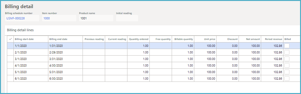 The following image shows the billing details for this item. The period revenue for each month is 102.86.