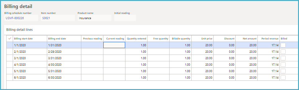 For example, Item 1000 is added to a billing schedule and is sold with insurance (Item S0021) with the following details: