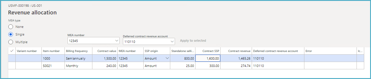 When an item that uses revenue allocation is terminated, the contract revenue amount of all items that belong to the same MEA number are updated. Review the following example to better understand the termination process.