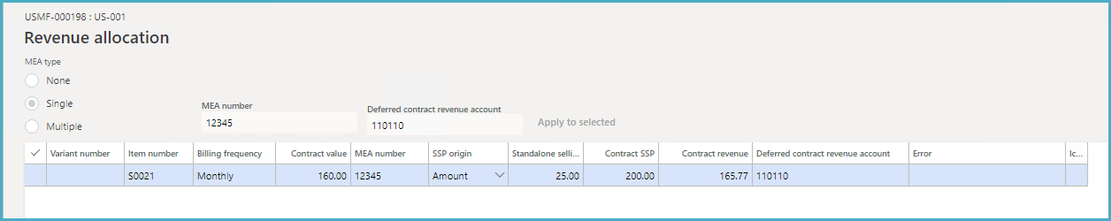 A billing line for Item 1000 is terminated on June 30, 2020. The other billing line for Item S0021 that belongs to the same MEA is still active and will be billed until the end of the term. With the line termination, the contract revenue amount is reduced to 165.77. The secondary item has the journal entry created, and it must be adjusted accordingly.